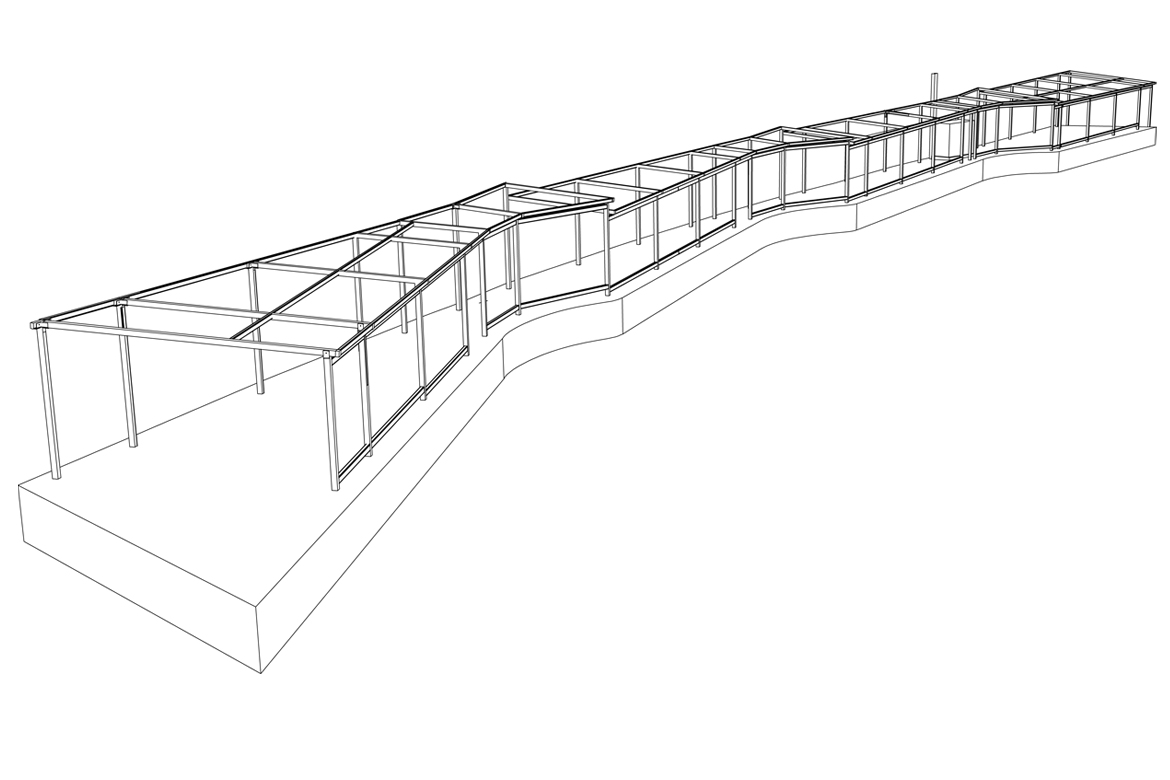 Designed around a pin jointed steel box section frame the canopy was stepped in three places to accommodate the slope. The steel frame provided support for the glazed front wall and also the structural roof glazing system.