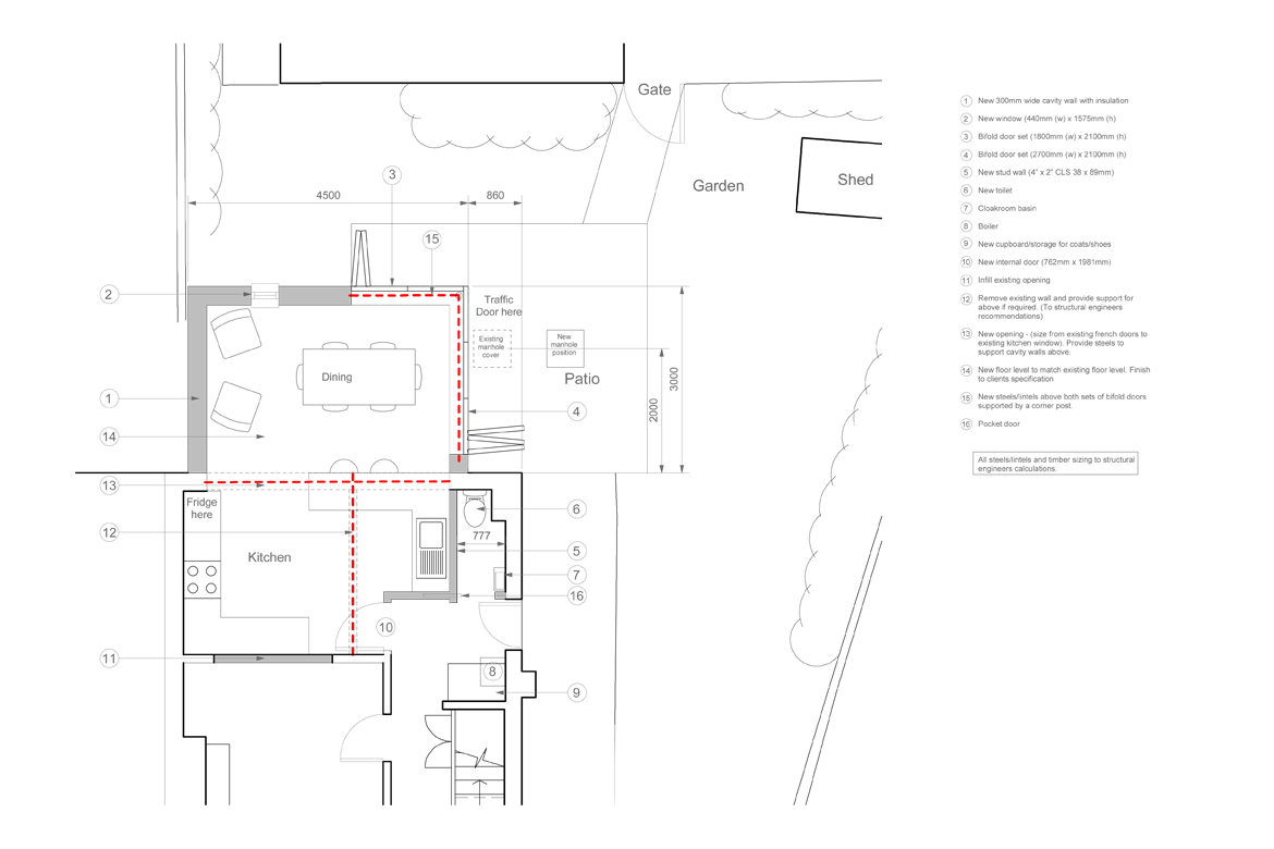 Whilst previously being awarded planning permission for a single storey extension, which had now lapsed, the client was looking for a new extension design for their property. With a growing family the requirements for the extension had now changed, so the client brief was to investigate a double storey extension to provide a large as possible increase to the floor area of the house.